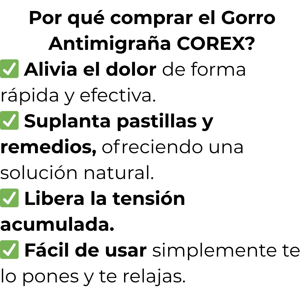 ¿Sufres de dolores de cabeza que te impiden concentrarte? La tensión diaria, el estrés y el uso excesivo de pantallas pueden pasarte factura. El Gorro Antimigraña COREX te ofrece una solución real y un alivio instantáneo.